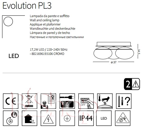 Кількість ламп: 3. Тип цоколя: LED. Висота (див): 37. Ширина (див): 37. Глибина (див): 14.5. Потужність лампи (Вт): 5.