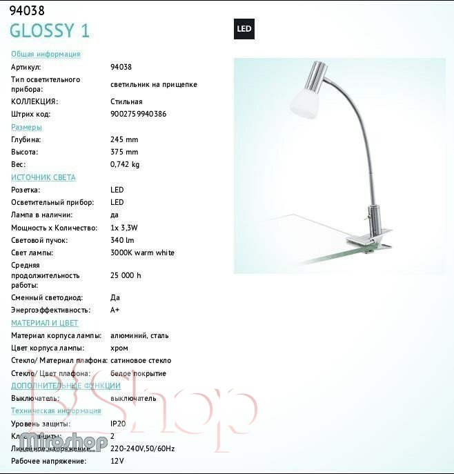 Кількість ламп: 1. Тип цоколя: LED. Висота (див): 37.5. Потужність лампи (Вт): 3. Довжина (див): 24.5.