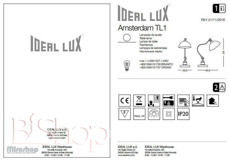 Кількість ламп: 1. Тип цоколя: E27. Висота (див): 52. Ширина (див): 20.5. Глибина (див): 40.5. Потужність лампи (Вт): 60.