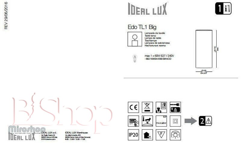 Кількість ламп: 1. Тип цоколя: E27. Висота (див): 35. Потужність лампи (Вт): 60. Діаметр (див): 12.