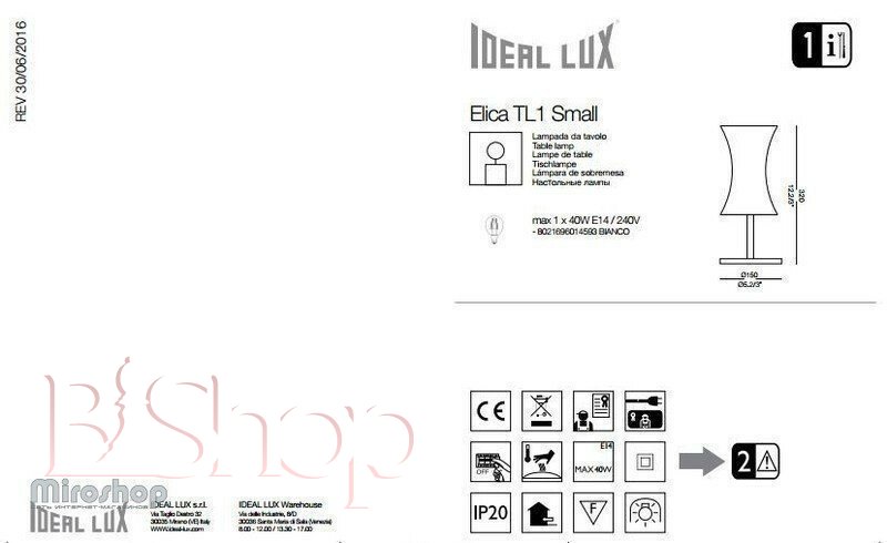 Кількість ламп: 1. Тип цоколя: E14. Висота (див): 32. Потужність лампи (Вт): 40. Діаметр (див): 15.