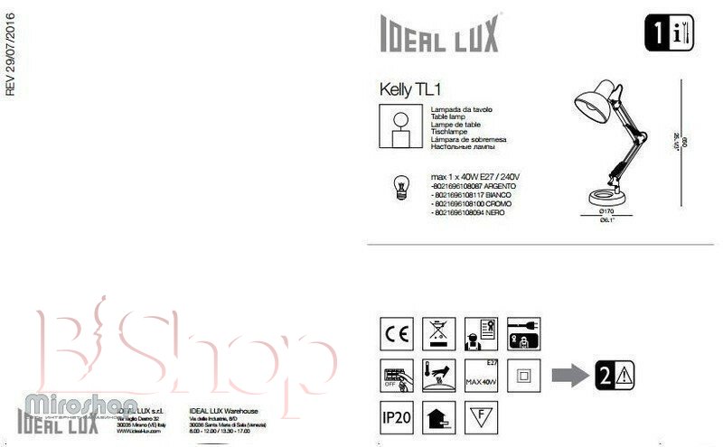 Кількість ламп: 1. Тип цоколя: E27. Висота (див): 65. Потужність лампи (Вт): 60. Діаметр (див): 17.