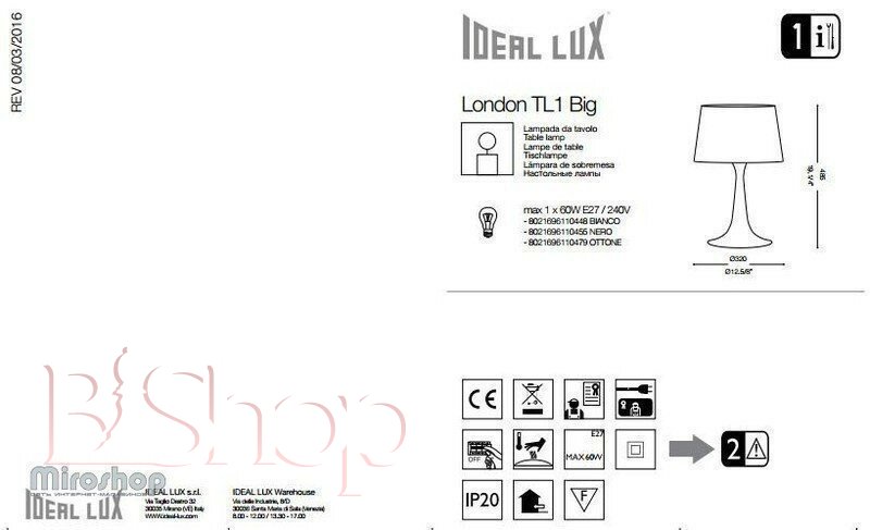 Кількість ламп: 1. Тип цоколя: E27. Висота (см): 48.5. Потужність лампи (Вт): 60. Діаметр (див): 32.