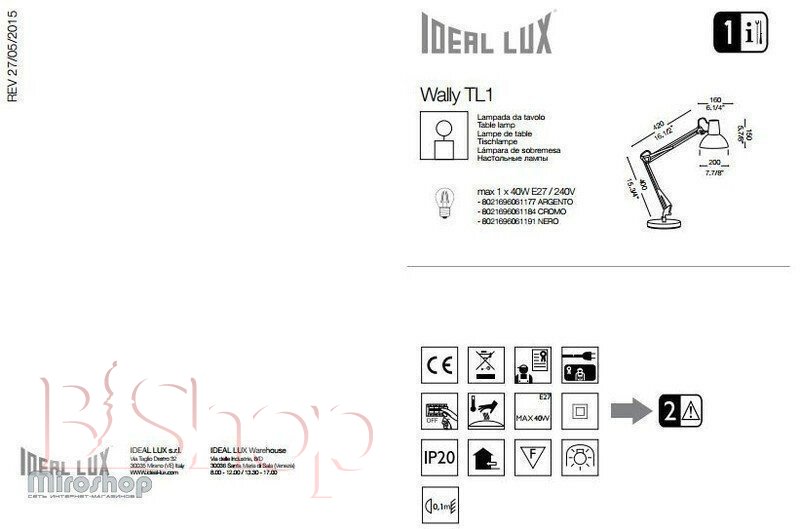Кількість ламп: 1. Тип цоколя: E27. Висота (див): 82. Потужність лампи (Вт): 60. Діаметр (див): 20.