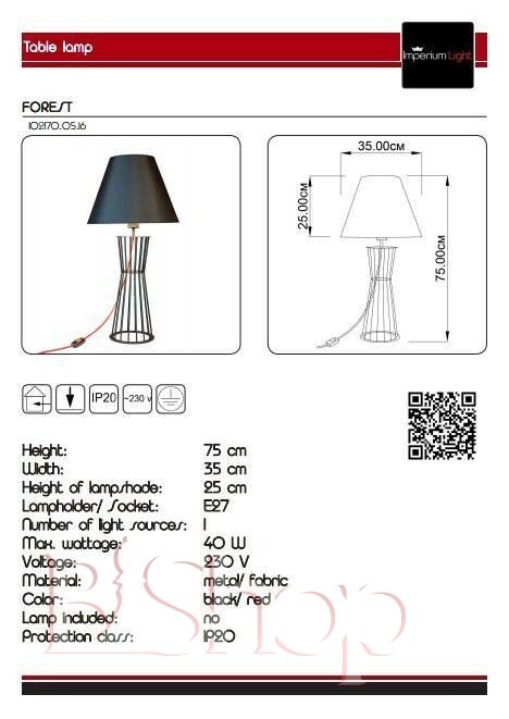 Кількість ламп: 1. Тип цоколя: E27. Висота (див): 75. Ширина (див): 35. Потужність лампи (Вт): 40.