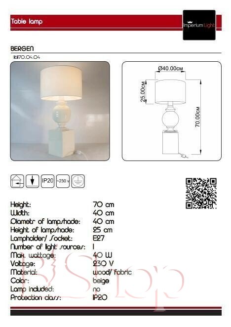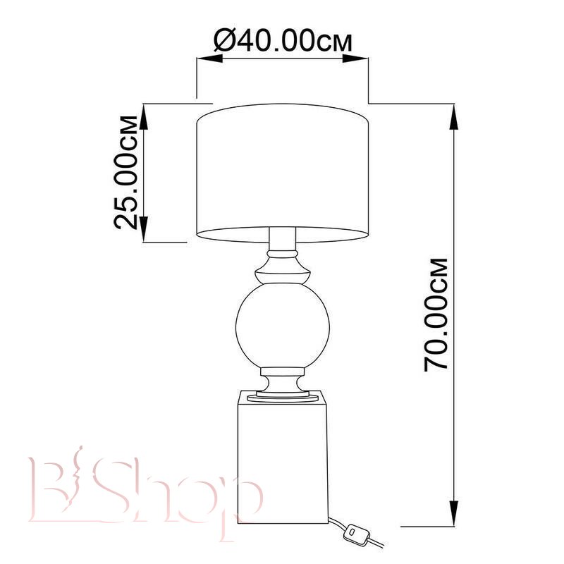 Кількість ламп: 1. Тип цоколя: E27. Висота (див): 70. Ширина (див): 40. Потужність лампи (Вт): 40. Діаметр (див): 40.