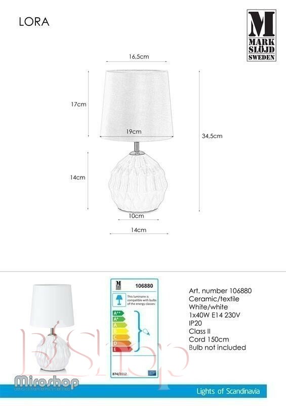 Кількість ламп: 1. Тип цоколя: E14. Висота (див): 34. Потужність лампи (Вт): 40. Діаметр (див): 18.