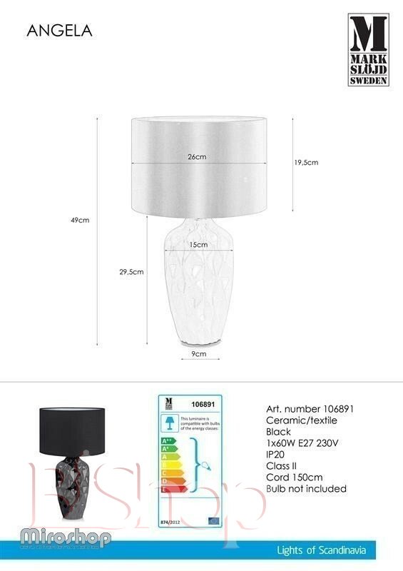 Кількість ламп: 1. Тип цоколя: E27. Висота (див): 49. Потужність лампи (Вт): 60. Діаметр (див): 26.