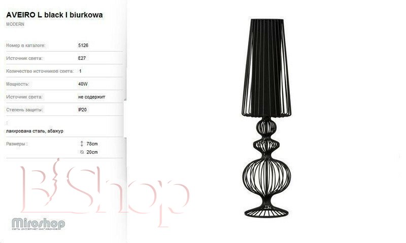 Кількість ламп: 1. Тип цоколя: E27. Висота (див): 78. Потужність лампи (Вт): 40. Діаметр (див): 20.