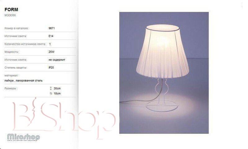 Кількість ламп: 1. Тип цоколя: E14. Висота (див): 30. Потужність лампи (Вт): 25. Діаметр (див): 18.