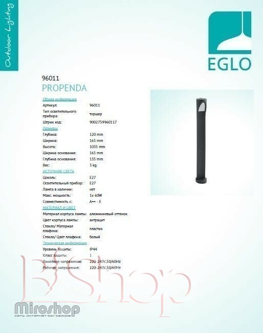 Кількість ламп: 1. Тип цоколя: E27. Висота (див): 103.5. Потужність лампи (Вт): 60. Діаметр (див): 16.5.