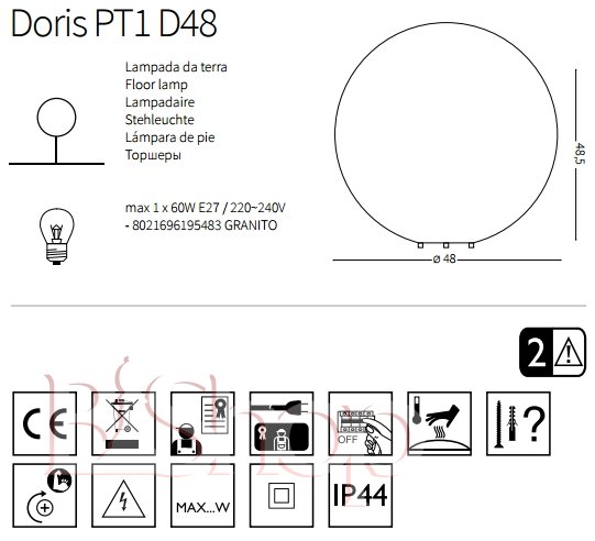 Кількість ламп: 1. Тип цоколя: E27. Висота (див): 48.5. Потужність лампи (Вт): 60. Діаметр (див): 48.