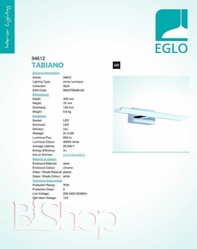 Кількість ламп: 2. Тип цоколя: LED. Висота (див): 7. Глибина (див): 13. Потужність лампи (Вт): 3.2. Довжина (див): 40.5.