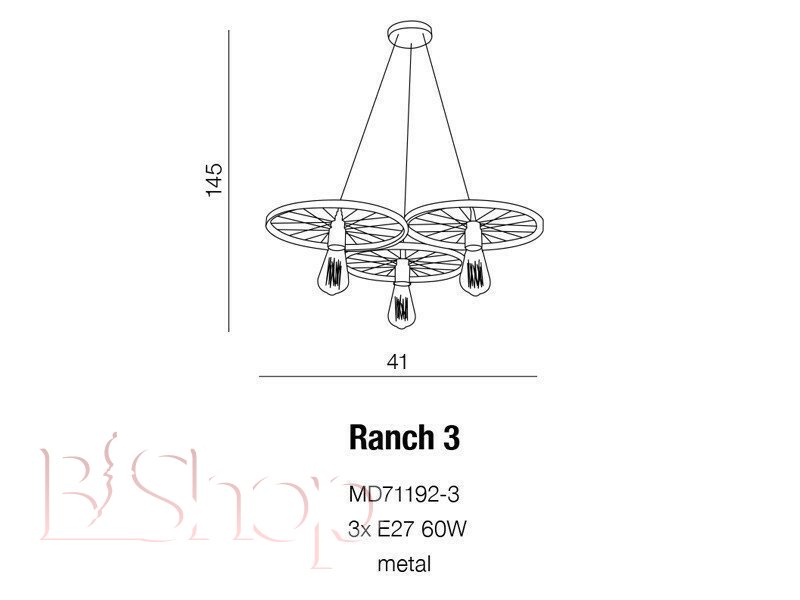 Кількість ламп: 3. Тип цоколя: E27. Висота (див): 145. Потужність лампи (Вт): 60. Діаметр (див): 41.