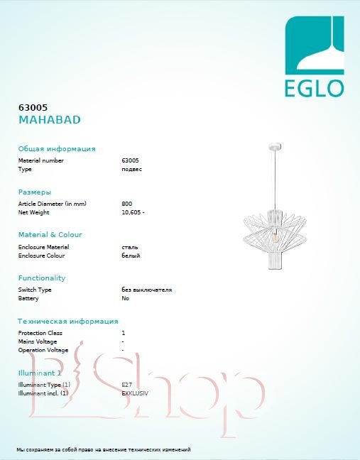 Кількість ламп: 1. Тип цоколя: E27. Висота (див): 271. Ширина (див): 80. Потужність лампи (Вт): 60.
