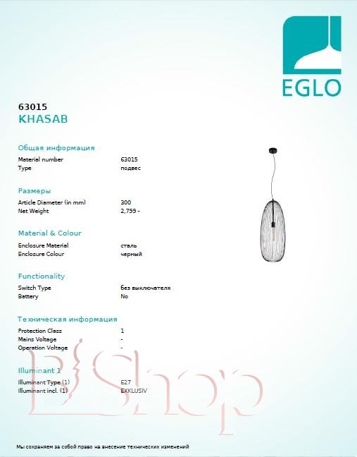 Кількість ламп: 1. Тип цоколя: E27. Висота (див): 270. Ширина (див): 30. Потужність лампи (Вт): 60.