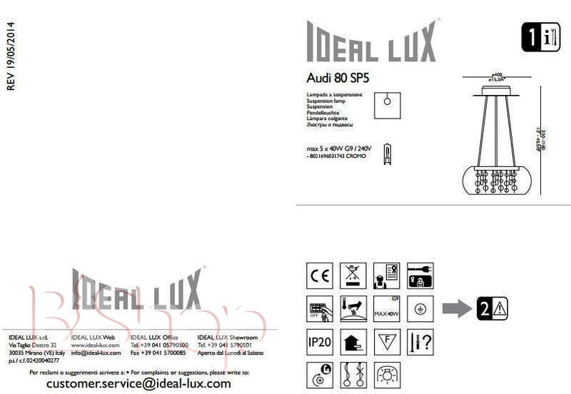 Кількість ламп: 5. Тип цоколя: G9. Висота (див): 116. Потужність лампи (Вт): 40. Діаметр (см): 40.
