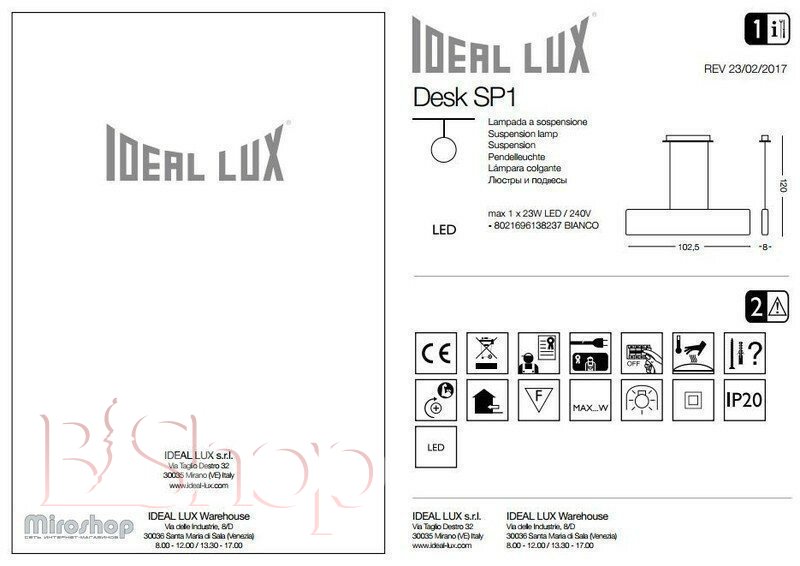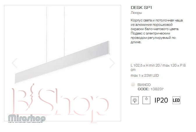 Кількість ламп: 1. Тип цоколя: LED. Висота (див): 120. Ширина (див): 8. Потужність лампи (Вт): 23. Довжина (див): 102.5.
