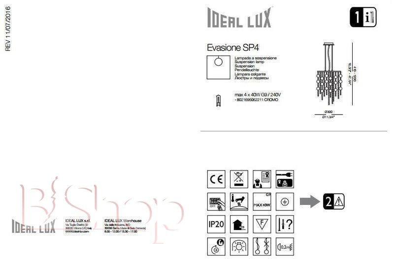 Кількість ламп: 4. Тип цоколя: G9. Висота (див): 120. Потужність лампи (Вт): 40. Діаметр (див): 30.