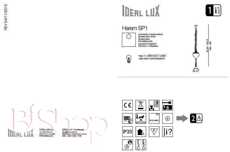 Підвісний світильник Ideal Lux HAREM SP1 (115979) (87895)