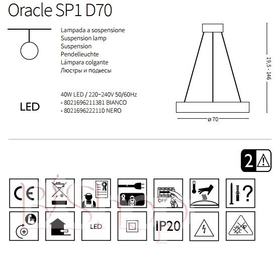 Кількість ламп: 1. Тип цоколя: LED. Висота (див): 146. Потужність лампи (Вт): 40. Діаметр (див): 70.