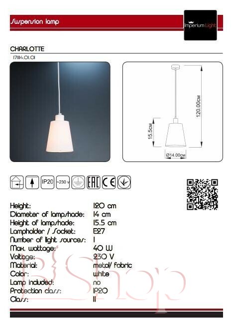 Кількість ламп: 1. Тип цоколя: E27. Висота (див): 120. Потужність лампи (Вт): 60. Діаметр (див): 14.
