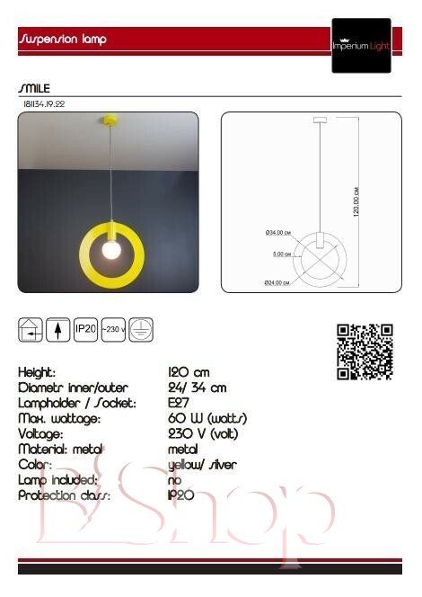 Кількість ламп: 1. Тип цоколя: E27. Висота (див): 120. Потужність лампи (Вт): 60. Діаметр (див): 34.