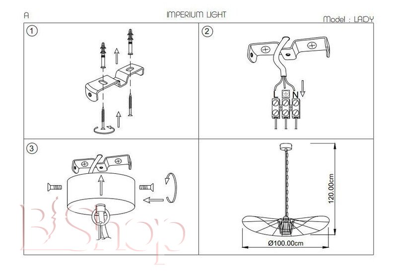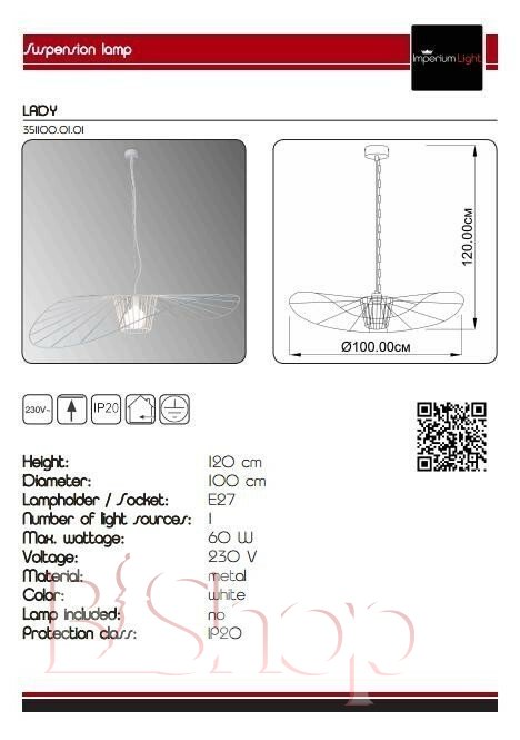 Кількість ламп: 1. Тип цоколя: E27. Висота (див): 120. Потужність лампи (Вт): 60. Діаметр (див): 100.