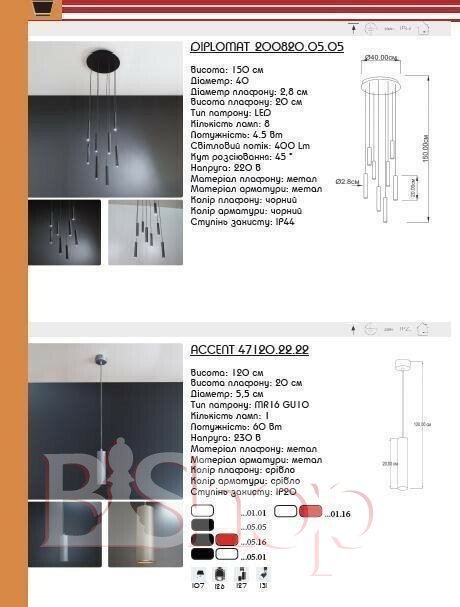 - Матеріал плафонів: Метал