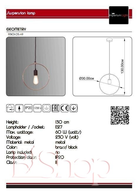 Кількість ламп: 1. Тип цоколя: E27. Висота (див): 130. Ширина (див): 30. Потужність лампи (Вт): 60.