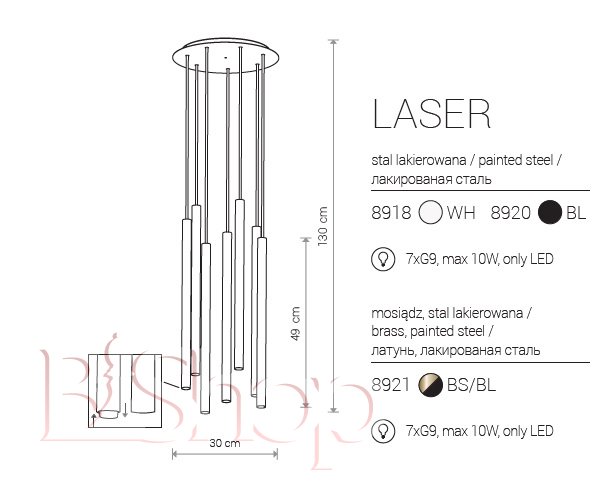 Кількість ламп: 7. Тип цоколя: G9. Висота (див): 130. Потужність лампи (Вт): 10. Діаметр (див): 30.
