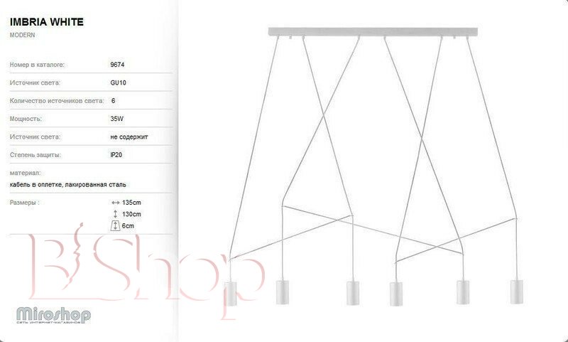 Кількість ламп: 6. Тип цоколя: GU10. Висота (див): 130. Ширина (див): 6. Потужність лампи (Вт): 35. Довжина (див): 135.