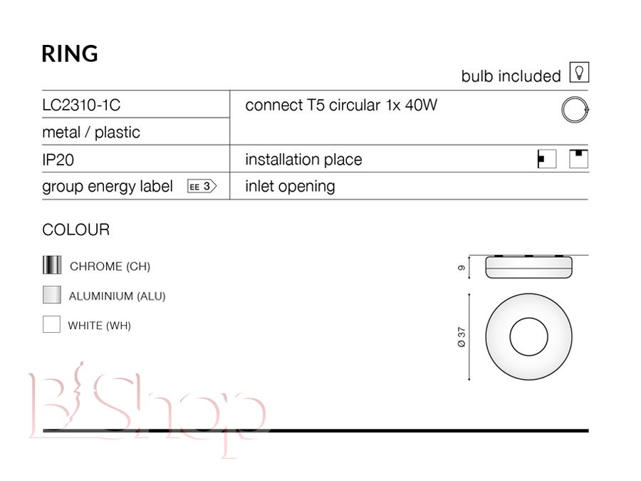 Кількість ламп: 1. Тип цоколя: T5. Висота (див): 9. Потужність лампи (Вт): 40. Діаметр (див): 37.