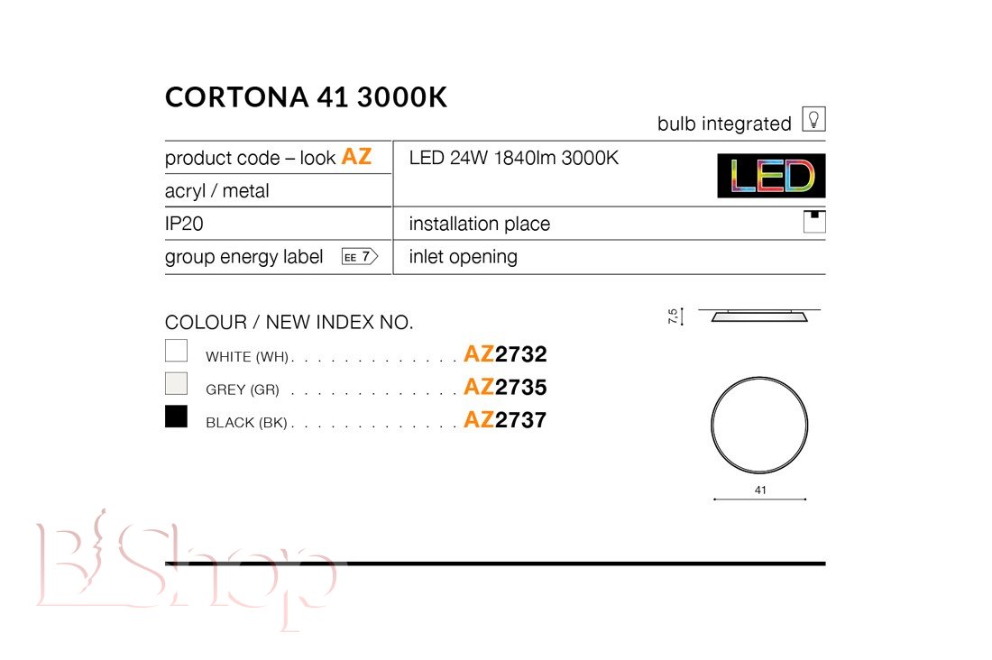 Кількість ламп: 1. Тип цоколя: LED. Висота (див): 7.5. Потужність лампи (Вт): 24. Діаметр (див): 41.