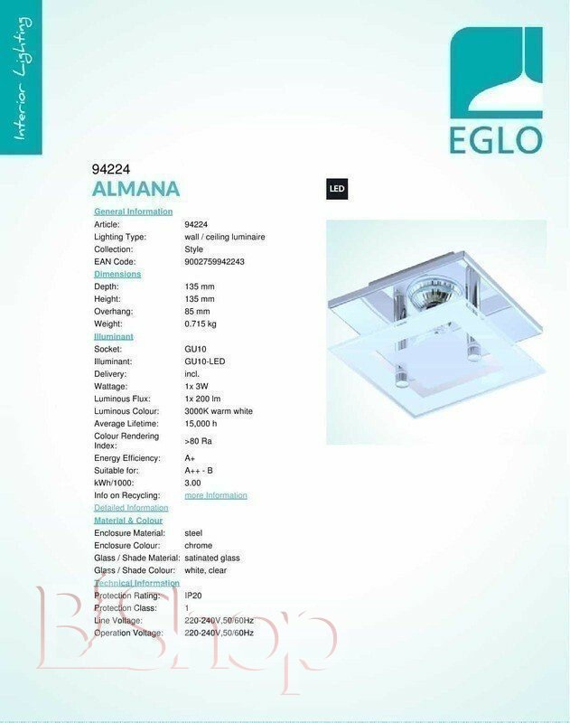 Кількість ламп: 1. Тип цоколя: GU10. Висота (див): 13.5. Ширина (див): 13.5. Глибина (див): 8.5. Потужність лампи (Вт): 3.