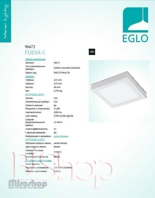 Кількість ламп: 1. Тип цоколя: LED. Висота (див): 3.5. Ширина (див): 22.5. Потужність лампи (Вт): 15.6. Довжина (див): 22.5.