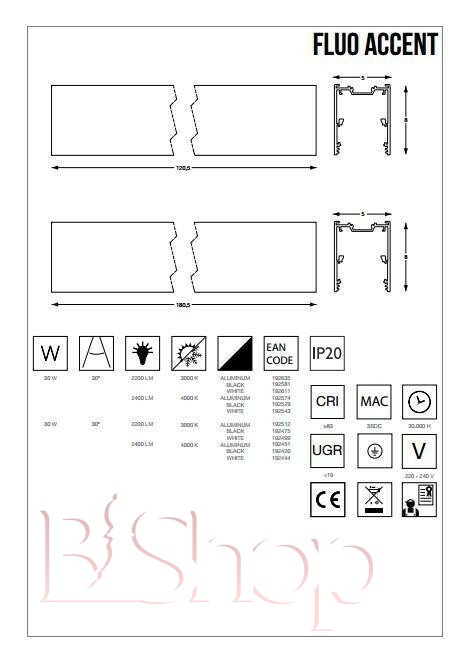 Кількість ламп: 1. Тип цоколя: LED. Висота (див): 8. Ширина (див): 5. Потужність лампи (Вт): 30. Довжина (див): 180.5.