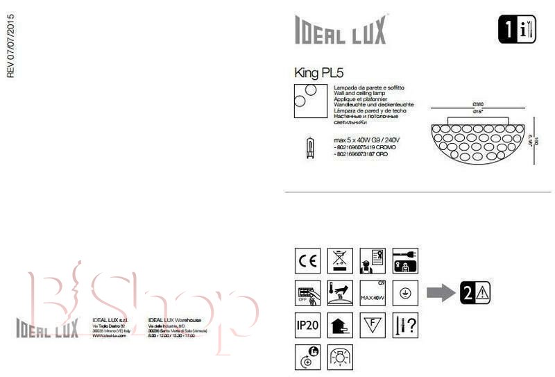 Кількість ламп: 5. Тип цоколя: G9. Висота (див): 16. Потужність лампи (Вт): 40. Діаметр (див): 38.