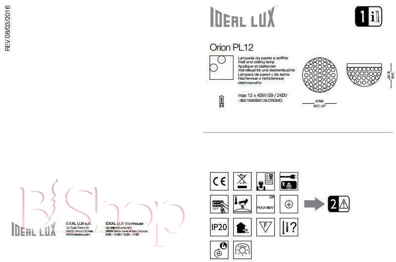 Кількість ламп: 12. Тип цоколя: G9. Висота (див): 24. Потужність лампи (Вт): 40. Діаметр (див): 70.