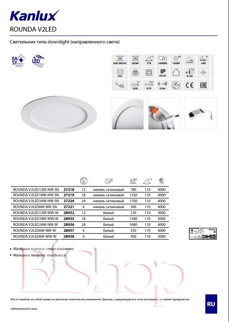 Кількість ламп: 1. Тип цоколя: LED. Потужність лампи (Вт): 6. Діаметр (див): 22. Розмір урізного отвору (див): 20.8.