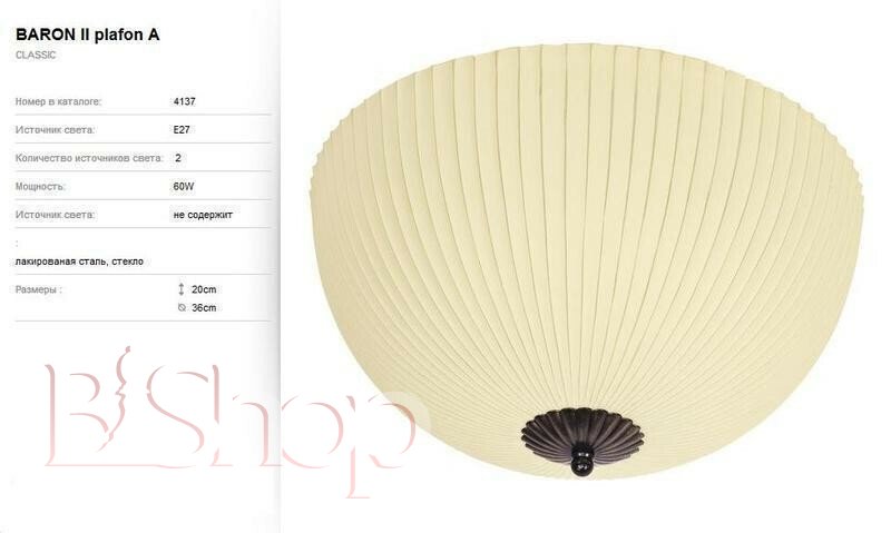 Кількість ламп: 2. Тип цоколя: E27. Висота (див): 20. Потужність лампи (Вт): 60. Діаметр (див): 36.