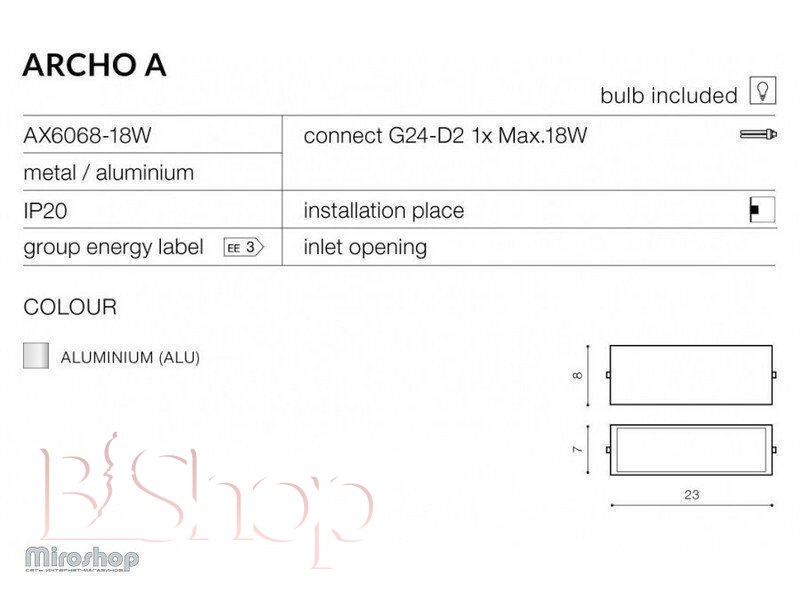 Количество ламп: 1. Тип цоколя: G24. Высота (см): 8. Ширина (см): 7. Мощность лампы (Вт): 18. Длина (см): 23.