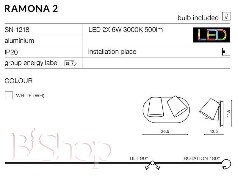 Количество ламп: 2. Тип цоколя: LED. Высота (см): 11.8. Глубина (см): 11.8. Мощность лампы (Вт): 6. Длина (см): 26.5.