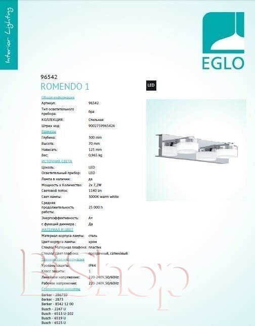 Количество ламп: 2. Тип цоколя: LED. Высота (см): 7. Ширина (см): 30. Глубина (см): 12.5. Мощность лампы (Вт): 7.2.