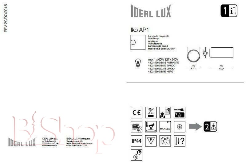 Количество ламп: 1. Тип цоколя: E27. Высота (см): 7. Глубина (см): 19. Мощность лампы (Вт): 60. Длина (см): 14.