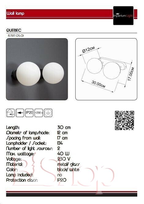 Количество ламп: 2. Тип цоколя: E14. Высота (см): 30. Ширина (см): 12. Глубина (см): 17. Мощность лампы (Вт): 40.