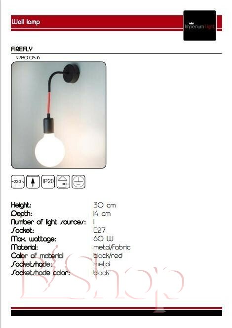 Количество ламп: 1. Тип цоколя: E27. Высота (см): 30. Глубина (см): 14. Мощность лампы (Вт): 60.