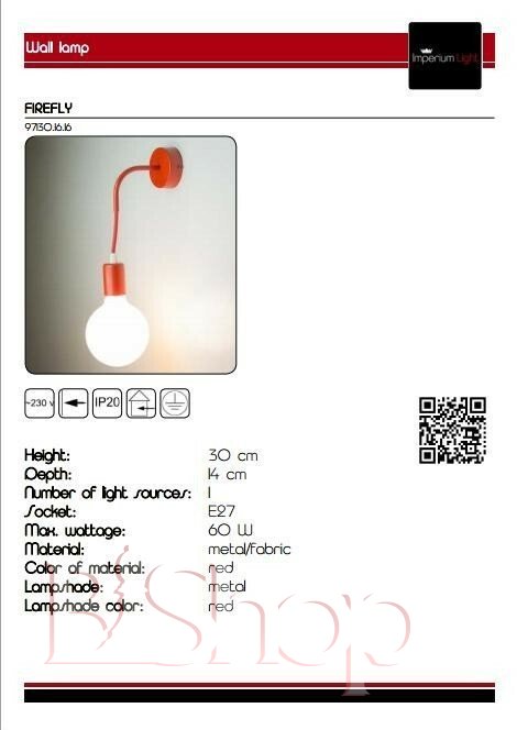 Количество ламп: 1. Тип цоколя: E27. Высота (см): 30. Глубина (см): 14. Мощность лампы (Вт): 60.