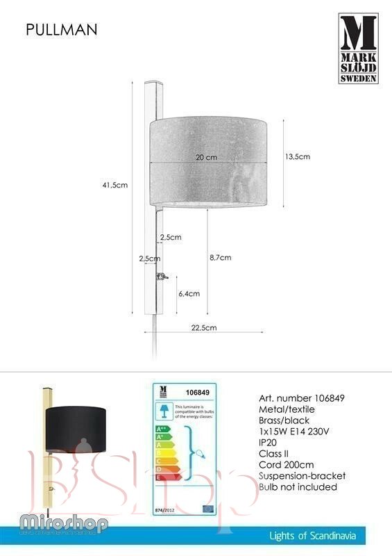 Количество ламп: 1. Тип цоколя: E14. Высота (см): 42. Ширина (см): 20. Глубина (см): 22.5. Мощность лампы (Вт): 15.