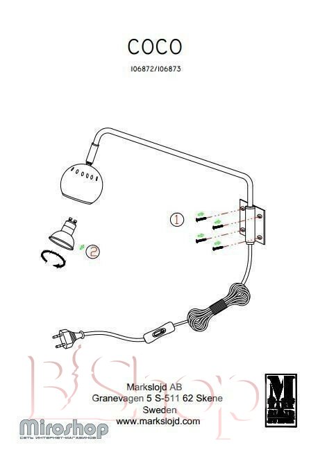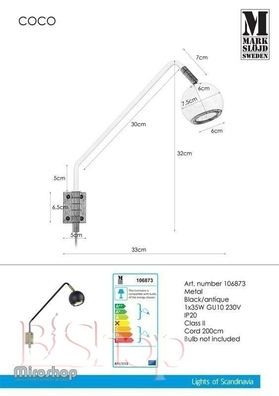 Количество ламп: 1. Тип цоколя: GU10. Высота (см): 33. Ширина (см): 8. Мощность лампы (Вт): 35.